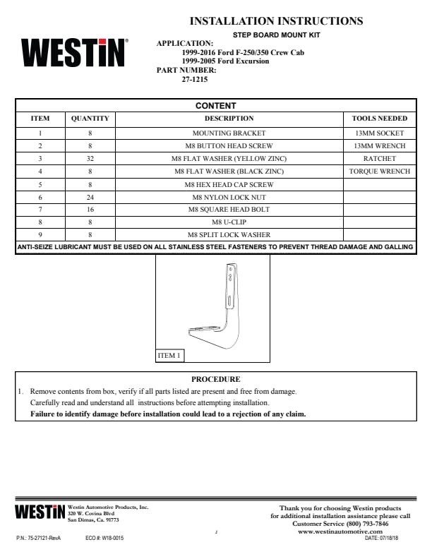 Westin 27-1215 Running Board Mount Kit fits 1999-2016 F250 F350 Crew Cab 1999-2005 Excursion |